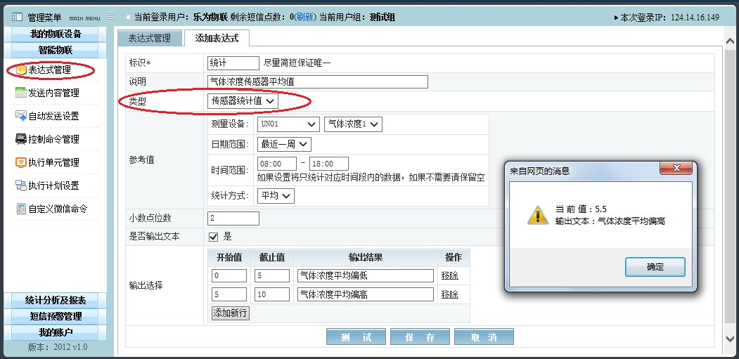 同样,基于该测量值可以输出自定义文本,例如上图所示,是最近一周的每天早8:00到下午18:00的统计值的平均值,如果低于5,则输出文本“气体浓度平局偏低”,如果大于5低于10,则输出文本“气体浓度平局偏高”。