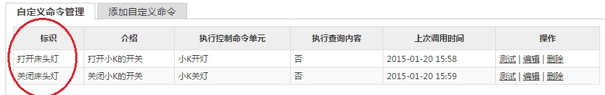 第五步,最关键的一步,就是来配置你的微信命令,进入菜单“智能物联”->“自定义微信命令”,配置好你来控制开灯和关灯的命令标识,也就是你后面语音要说的命令哦。