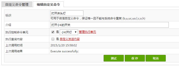 同样配置好“关灯”的微信命令,仍然可以点击“测试”来进行检验。配置好了,在你的微信命令列表里,你会看到你定义的微信命令。