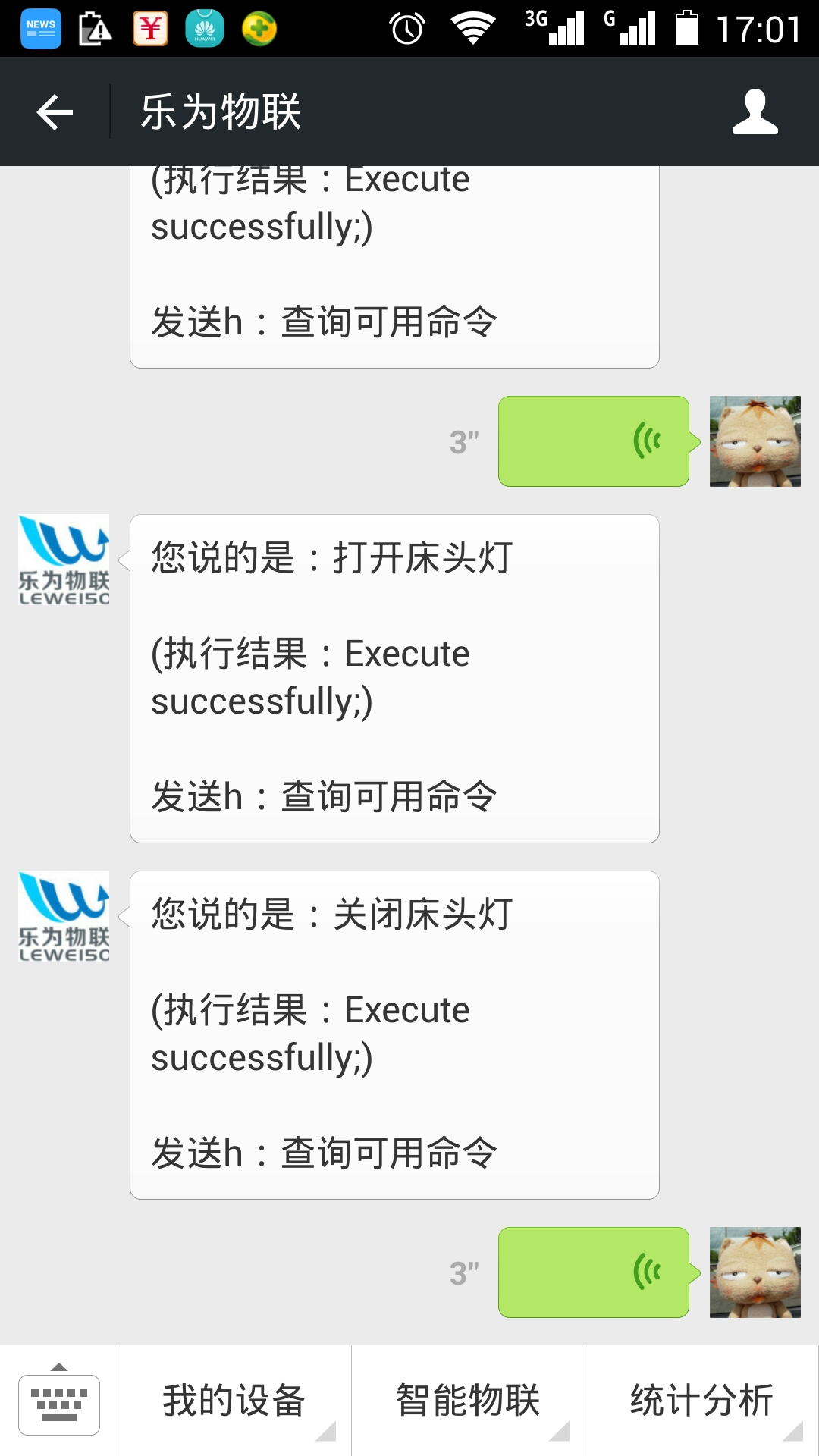 最后,就是关注“乐为物联”的官方微信账号,绑定好你的账号(没有绑定的用户发送“b”,然后按照提示输入你乐联网的用户名和密码就好了),然后发起语音微信就好了,对着微信说出上图中你自己配置的命令标识就好了,记得点击微信的“按住说话”,要稍等1s再说,,另外要说普通话哦。(微信最好是最新的版本!)