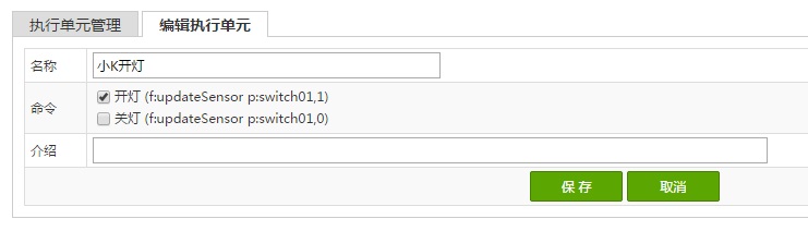 第四步,进入菜单“智能物联”->“执行单元管理”,来“添加执行单元”,这里比较简单,写个名称,勾选一下之前的执行单元就好了。同样配置好“关灯”的执行单元,同样保存以后,可以点击“测试”来看小K的反应,确认是否配置成功。