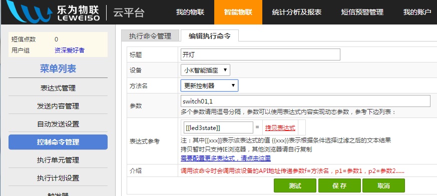 第三步,进入菜单“智能物联”->“控制命令管理”界面,然后“添加执行命令”,按照下面进行配置“开灯”的命令,注意“参数”里面的“switch01”是你配置的控制器的标识,要一致。“1”表示“开灯”,“0”表示“关灯”,这个就不用我多说了吧。同样的方法可以配置“关灯”的命令,配置完可以点击“测试”按钮,看看小K是否有反应就知道是否配置成功。