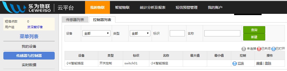 第二步,下面以小K智能开关为例,前提条件是你已经配置好了控制网关和控制器,如下图,这里小K的标识我配置成switch01(任意字母,数字或他们的组合都可以)。