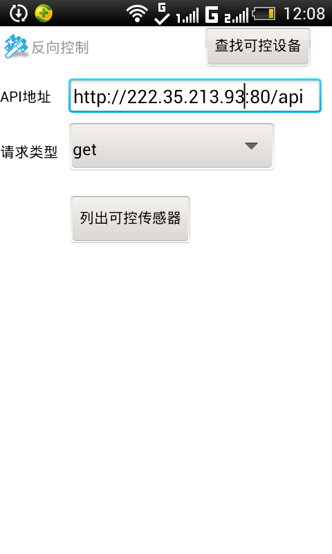 3 进入反向控制,设置“API地址”如下:点击列出传感器(先不要点击查找可控设备,公网查找可控设备的功能还没做完)