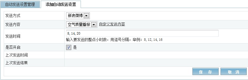 第四步,就是设置自动发送时间,这个比较简单,点击“自动发送设置”, 选择“添加自动发送设置”,输入要发送的整点小时数(目前只支持整点),用逗号分隔,本例中需要输入8,14,20。表示每天的8点,14点和20点定时发送。