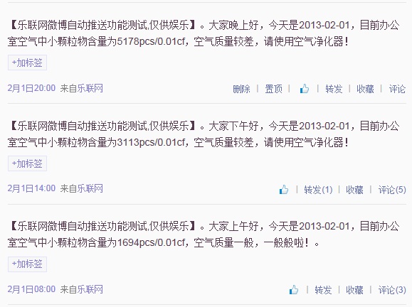 【乐联网微博自动推送功能测试,仅供娱乐】。大家上午好,今天是2013-02-02,目前办公室空气中小颗粒物含量为4993pcs/0.01cf,空气质量较差,请使用空气净化器!