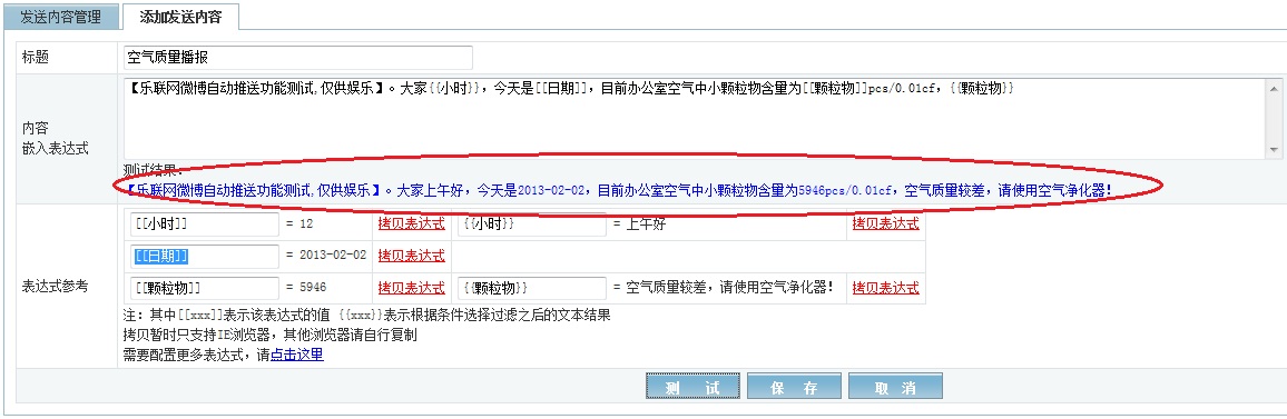 第三步,就是要设置发送内容,点击“发送内容管理”,设置和测试如下图,其中两个方括号“[[ ]]”中内容表示返回括号中的系统变量值或者传感器测量值或更复杂的传感器测量值的逻辑运算结果,例如“[[日期]]”返回的就是当前日期;而两个大括号“{{}}”中的内容表示由括号里面的值的范围对应的应推送的微博文本内容。例如下图中{{颗粒物}},当前小颗粒物含量的测量值为5946,根据之前在表达式中设置的逻辑对应关系,此时返回的文本应该为“空气质量较差,请使用空气净化器!”。设置好后同样可以点击测试,看看设置的是否正确。