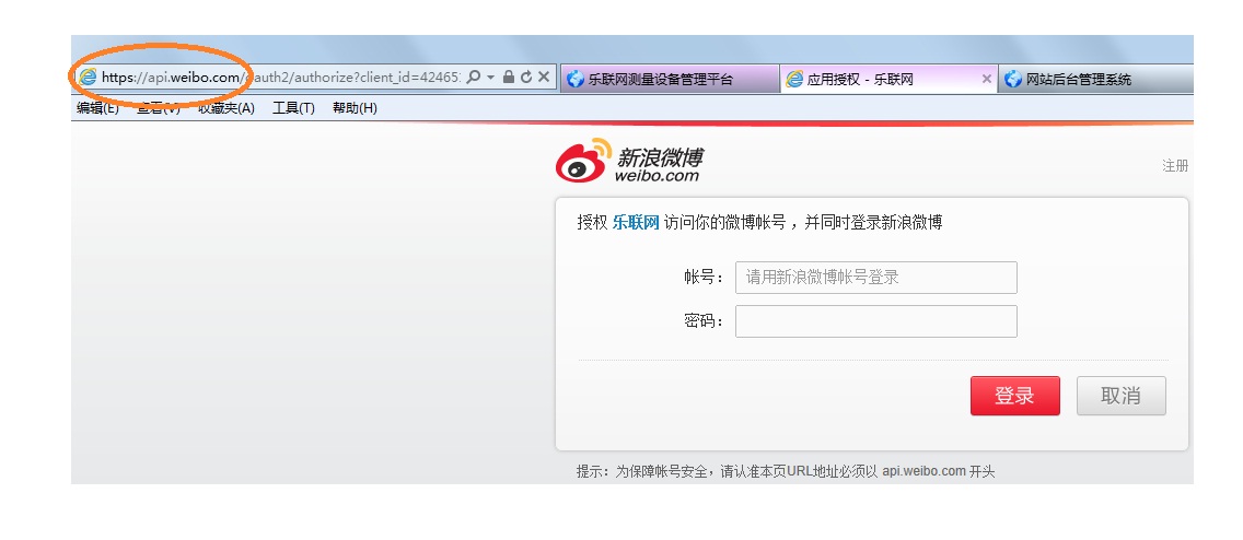 注意:为保障账号安全,一定要认准绑定微博的网页是以api.weibo.com的URL地址。