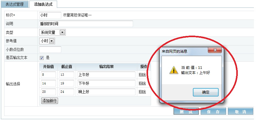 首先看根据系统变量“小时”的范围来让微博发送不同的内容“上午好”,“下午好”和“晚上好”,点击“添加表达式”,按照以下的内容进行填写,注意“类型”选择“系统变量”,系统变量包括“小时”、“日期”、“时间”,选择“小时”,“小数点位数”此处不涉及,然后选择输出文本(勾选“是”),然后根据我们之前的逻辑关系设置,设置好了点击“测试”,可以看到当前时间为11点,那么则返回文本为“上午好”(在上午好的8-13的范围内)。