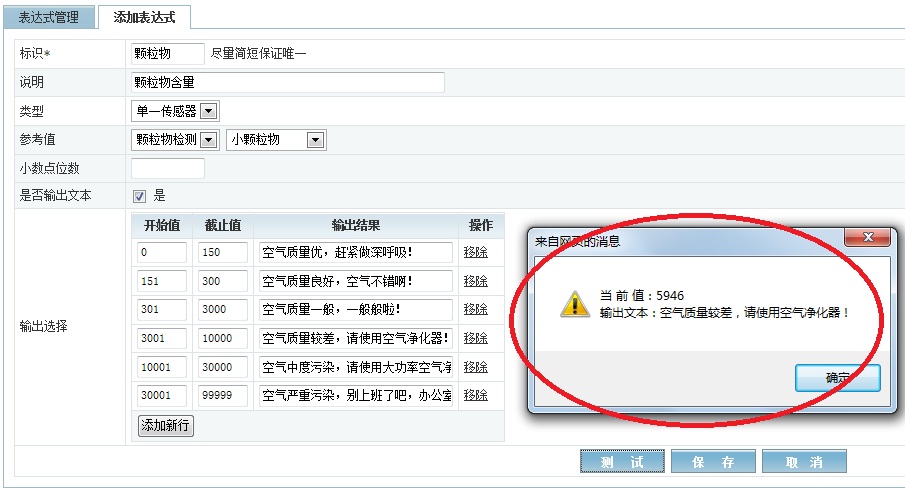 最后来设置根据不同的小颗粒物PM2.5测量值来输出不容的微博文本,这里“类型”选择“单一传感器”,在“参考值”里面选择网关“颗粒物检测”和传感器“小颗粒物”。这里的测量值取值到整数,所以不需要设置小数点位数,如果测量值有小数,你可以在这里填写,填写的格式为“.0”,“.00”等等。输出文本与测量值范围的逻辑如下,这里你可以自己定义。然后点击“测试”可以检查设置的结果是否正确。